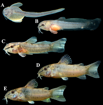 Remarks. Corydoras maclurei has been bred under aquarium conditions by one of the authors (HGE), who documented its ontogenetic development from 8 to 28 mm LT, showing general changes in external morphology and color pattern (Fig. 11). Specimen with 8.0 mm TL in yolk-sac stage (Fig. 11A); head slightly depressed, with short and conspicuously rounded snout; barbels moderate in size and with well-developed papillae, which will gradually become less developed along individual’s growth; eye large; median fin fold present, extending from postcephalic region to genital opening; fin rays indistinct, with pectoral fin fold oblong; body plates absent; body covered by dark-brown or black chromatophores; body covered by greenish yellow iridescent coloration. Specimen with 12.0 mm TL in final flexion stage (Fig. 11B); dorsal- and caudal-fin rays distinct, but fins not detached from fin fold; pectoral-fin rays distinct; anal, pelvic and adipose fins not distinct; caudal-fin asymmetrical, dorsal portion distinctly longer than ventral; hypural plates visible by transparency; conspicuous, oblique dark stripe from anteroventral margin of orbit to upper lip lateral area. Specimen with 16.0 mm TL in early post-flexion stage (Fig. 11C) displays more pronounced snout; reduction of median fold, with dorsal, anal and caudal fins partially detached; pectoral fin slightly more developed; pelvic- and anal-fin rays distinct; adipose fin indistinct; beginning of formation of lateral body plates; slightly more pigmented body, with diffuse dark patches. Juvenile specimens with 21.0 and 28.0 mm TL (Figs. 11D, E), respectively, are strongly similar to each other, except for except for gradual development of lateral body plates and fin spines, and conspicuous dark patch on anterodorsal portion of flank in larger specimen; snout slightly more pronounced; median fold absorbed, with distinct adipose, caudal and anal fins.