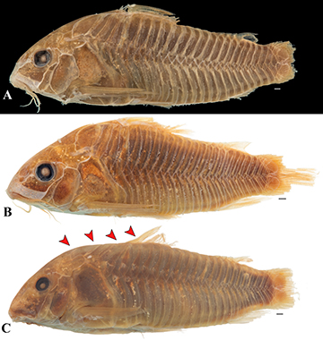FIGURE 13| Type specimens of Corydoras aeneus, showing the lectotype (A, USNM 1116) and paralectotypes (B, C, USNM 205649 and USNM 92819, respectively) of Hoplosoma aeneum. Red arrows in C indicates the area affected by a malformation on predorsal region of body. Photographs by Sandra Raredon. Scale bar = 1 mm.