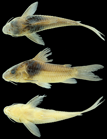 Color in alcohol. Overall color of body in Fig. 1. Ground color of body pale- to brownish yellow or beige, with top of head dark brown. Dorsal and lateral surface of head, and lateral surface of cleithrum covered by dark brown or black chromatophores, not forming blotches; posterior margin of cleithrum with conspicuous concentration of dark brown or black chromatophores, forming thin dark line, which is more evident on dorsal half of cleithrum. Border of pores of laterosensory canals typically with conspicuous concentration of dark brown or black chromatophores. Anterodorsal portion of flank, just below anterior portion of dorsal-fin base, with large, conspicuous dark brown or black blotch, ranging from somewhat rounded to roughly diamond shaped. Remaining portions of dorso- and ventrolateral body plates covered by dark brown or black chromatophores, not forming blotches; ventral portion of ventrolateral body plates, especially on region around pelvic-fin origin, devoid of or with sparse chromatophores. Posterior margin of body plates with conspicuous concentration of dark brown or black chromatophores, forming thin dark lines, typically more evident on dorsal portion of dorsolateral body plates, azygous precaudal and preadipose plates, and on dorsolateral body plates below dorsal-fin base. Dorsal and adipose fins entirely covered by numerous brown or black chromatophores, not forming blotches. Pectoral, pelvic, anal and caudal fins with conspicuous concentrations of brown or black chromatophores on rays, not forming blotches; membranes typically devoid of or with sparse chromatophores.