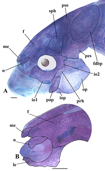 Additionally, the ischiac process of the basipterygium is further divided into a dorsal and a ventral process following Huysentruyt, Adriaens (2005). Nomenclature of the laterosensory canals and preopercular pores are according to Schaefer, Aquino (2000) and Schaefer (1988), respectively. The supra-preopercle sensu Huysentruyt, Adriaens (2005) was treated here as a part of the hyomandibula according to Vera-Alcaraz (2013). To determine the development degree of the anterior laminar expansion of infraorbital 1 in relation to the nasal capsule, the specimen was positioned to maintain the largest diameter of the nasal capsule horizontally. The width of frontal bone was obtained at the same point as the least interorbital width. Vertebral counts include only free centra, with the compound caudal centrum (preural 1+ ural 1) counted as a single element. The last two dorsal-fin rays were counted as distinct elements. Pharyngeal teeth were counted in both sides of the branchial arches. Terminology regarding initial development follows Nakatani et al. (2001); the size of specimens in initial development is exceptionally expressed in total length (TL).