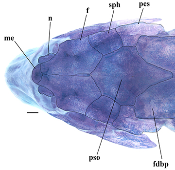 FIGURE 3| Dorsal view of the head of a c&s paratype of Corydoras maclurei, CITL 430, 47.8 mm SL. Abbreviations: f: frontal, fdbp: first dorsolateral body plate, n: nasal, me: mesethmoid, pes: pterotic-extrascapular, pso: parieto-supraoccipital, sph: sphenotic. Scale bar = 1 mm.