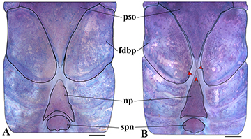 FIGURE 4| Predorsal region of trunk in c&s paratypes of Corydoras maclurei, showing the variation in the distance between the posterior process of the parieto-supraoccipital and the nuchal plate, which ranges from (A) clearly separated from each other (CITL 430, 45.6 mm SL) to (B) separated but nearly contacting (CITL 430, 38.2 mm SL). Abbreviations: fdbp: first dorsolateral body plate, np: nuchal plate, pso: parieto-supraoccipital, spn: spinelet. Dotted lines indicate the limits of the tip of the posterior process of the parieto-supraoccipital and anterior tip of the nuchal plate. Red arrows indicate the small platelets between parieto-supraoccipital and nuchal plate. Scale bar = 1 mm.