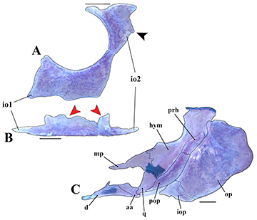 FIGURE 5| Infraorbital series in lateral (A) and dorsal (B) views, and (C) suspensorium plus operculum in lateral view of a c&s paratype of Corydoras maclurei (CITL 430, 38.2 mm SL). Abbreviations: aa: angulo-articular, d: dentary, hym: hyomandibula, io1–2: infraorbital 1 and 2, iop: interopercle, mp: metapterygoid, op: opercle, pop: preopercle, prh: posterodorsal ridge of hyomandibula, q: quadrate. Black arrow indicates the roughly triangular process on middle portion of posterior margin of infraorbital 2, and red arrows indicate inner laminar expansion of both infraorbitals. Scale bar = 1 mm.