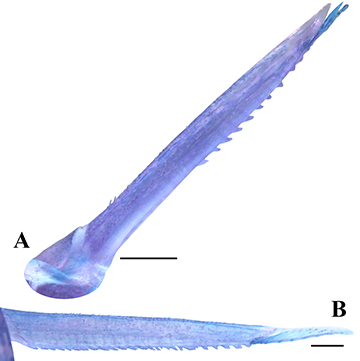 FIGURE 6| Lateral view of (A) the dorsal-fin spine (38.2 mm SL) and dorsal view of (B) the right pectoral-fin spine (47.8 mm SL), showing the serration patterns in c&s paratypes of Corydoras maclurei (CITL 430). Scale bars = 1 mm.