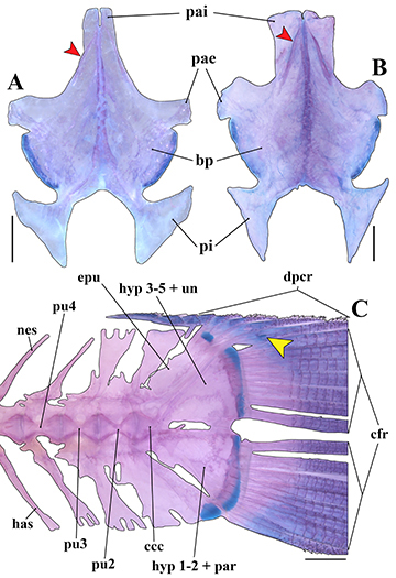 FIGURE 7| Pelvic girdle and caudal skeleton in c&s paratypes of Corydoras maclurei (CITL 430). A. Anterior internal process of basipterygium slightly laterally expanded, and anterior external process not expanded posteriorly (38.2 mm SL); B. Anterior internal process of basipterygium conspicuously laterally expanded, and anterior external process slightly expanded posteriorly (47.8 mm SL); C. General morphology of caudal skeleton, showing the small cartilage (yellow arrow) between upper principal and procurrent caudal-fin rays (38.2 mm SL). Abbreviations: bp: basipterygium, ccc: compound caudal centrum, cfr: caudal-fin principal rays, dpcr: dorsal procurrent rays, epu: epural, has: haemal spine, hyp 1–5: hypurals 1 to 5, nes: neural spine, pae: anterior external process, pai: anterior internal process, par: parhypural, pi: dorsal ischiac process, pu 2–4: preural centra 2 to 4, un: uroneural. Red arrows in A and B indicate the dorsal lamina on anterior internal process of basipterygium. Scale bars = 1 mm.