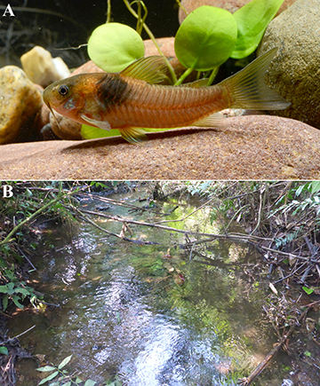 FIGURE 8| Uncatalogued aquarium specimen of Corydoras maclurei (A) showing its typical color pattern in life (lateral view), collected in its type-locality (B), a small stream tributary to the rio Araza, rio Madre de Dios basin, rio Madeira basin in Peru.