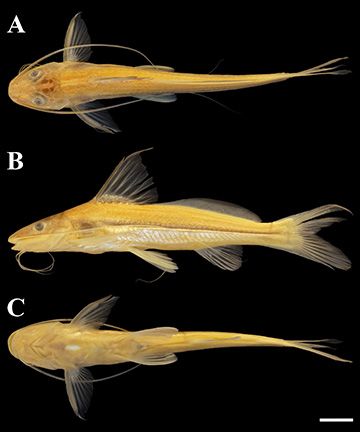 FIGURE 1| Pimelodella guato, holotype, ZUFMS-PIS 8515, 78.5 mm SL, Brazil, Mato Grosso do Sul, Corumbá municipality, rio Paraguai basin, rio Miranda, sandy beaches at Passo do Lontra region, 19°34’37”S 57°00’42”W. A. Dorsal; B. Left lateral; and C. Ventral views. Scale bar = 1 cm.