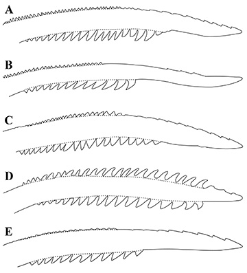 Pectoral-fin rays I,7(4)–I,9(5) (holotype I,8), pectoral-fin triangular with convex or slightly straight distal margin. First pectoral-fin ray curved, with proximal part rigid, forming a spine, and short distal tip, flexible and distinctly segmented. Pectoral-fin spine long, 5.5 to 6.5 times in SL. Anterior margin of pectoral-fin spine with small, straight spinules along its basal two-thirds and flat spinules along its distal third (Fig. 3A). Posterior margin of pectoral-fin spine bearing 13–23 (holotype 17) retrorse blades along basal two-thirds (Fig. 3A). Blades larger and more inclined, hook-like, near distal tip, meanwhile smaller, less inclined, near pectoral-fin base.