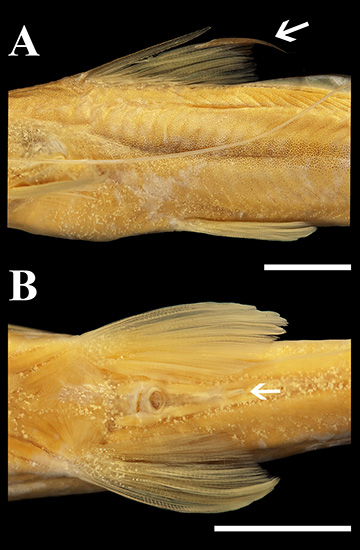FIGURE 5| Sexually dimorphic traitsin an adult male specimen ofPimelodella guato (paratype, CIUnB 1772, 93.8 mm SL). A. Filament on the non-spinous portion of dorsal-fin second (unbranched) ray, indicated by a white arrow; and B. Enlarged urogenital papilla, indicated by a white arrow. Scale bars = 1 cm.