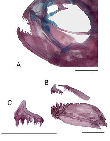 FIGURE 3| Inpaichthys parauapiranga, paratype, CPUFMT 7891, 24.4 mm SL. A. Anterior region of cranium; B. Upper and lower jaws; C. Premaxillary; right side, lateral view. Scale bars = 1 mm.