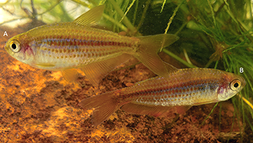 FIGURE 1| Inpaichthys nambiquara,new combination, in life. A. Male; B. Female. Photos by Hans-Georg Evers.