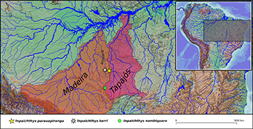 FIGURE 5| Map of South America with a detailed view of the southwestern portion of the Amazon basin, showing the distribution of the three Inpaichthys species (I. kerri, I. nambiquara, and I. parauapiranga) in the rio Madeira basin and rio Tapajós basin.
