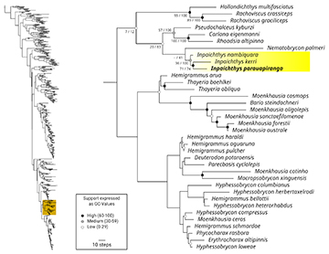 The phylogenetic position of the, until now, monotypic genus Inpaichthys was a subject of debate ever since its original description. Géry, Junk (1977:418) considered the genus “difficult to position”. These authors considered Inpaichthys kerri as similar and possibly related to Coelurichthys tenuis Nichols, 1913 [a synonym of Mimagoniates lateralis (Nichols, 1913)], a species currently included in the subfamily Stevardiinae. They also surmised putative relationships with the genera Nematobrycon (based mostly on color pattern), Rachoviscus, and Bryconella Géry, 1965 (the latter based on a similar arrangement of the premaxillary teeth).