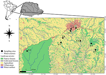 Monitoring website (https://www.cnpm.embrapa.br/projetos/relevobr/download/pr/pr.htm; Miranda, 2005). The geographical coordinates of the sampling sites were entered into QGIS, and using the GRASS plug-in in QGIS, the DEM raster was opened, and the catchment area of each sampling site was delimited using the “r.watershed” and “r.water.outlet” tools. In addition, we used a raster with land use and cover data (30 x 30 m; Projeto MapBiomas, 2018) as a basis for calculating the different land uses and covers within the polygon of the delimited watershed. We calculated the area (in km2) of forest cover, areas with urban development (such as sidewalks, residential, and industrial areas), and areas with agricultural activities (including pastures, annual and perennial crop plantations, and forestry). Consequently, areas with urbanization and agriculture showed lower percentages of forest cover.