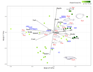 Data analysis. In our effort to elucidate the relationships between the morphological traits of the fish fauna and the environmental descriptors corresponding to varying forest cover gradient, we applied a RLQ ordination (R-mode linked to Q-mode) followed by a fourth-corner analysis (Dray, Legendre, 2008; Dray et al., 2014). For this, firstly, we identified and removed highly correlated predictors using Spearman’s correlation analysis (where the correlation coefficient threshold was set as r ≥ 0.7, p < 0.05). Consequently, we excluded ‘total solids’, which exhibited a positive correlation with ‘conductivity’ (r = 0.74), and ‘flow’, wich displayed a positive correlation with ‘depth’ (r = 0.91).
