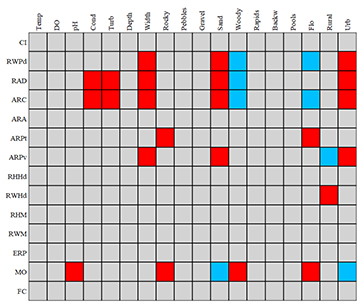 The fourth-corner analysis results, obtained after RLQ, showed that the morphological traits were significantly associated with environmental variables (p < 0.05) (Fig. 3; Tab. S7). We observed positive correlations for ARC (r = 0.54), RAD (r = 0.51), RWPd (r = 0.47), and ARPv (r = 0. 41) with the stream width. ARC and RAD were related to conductivity (r = 0.45 and 0.41, respectively) and turbidity (r = 0.44 and 0.48, respectively). MO (r = 0.43), and ARPt (r = 0.41) were associated with rocky substrate. MO was also associated with woody debris (r = 0.38) and pH (r = 0.37). While ARPv (r = 0.42), ARC (r = 0.61), RAD (r = 0.5), and RWPd were correlated with sand (r = 0.5). Otherwise, negative correlations were observed for ARC (r = -0.54), RWPd (r = -0.48), and RAD (r = -0.47) with woody debris, and MO (r = -0.48) to sand substrate.