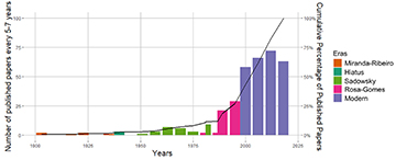 FIGURE 1| Number of publications every 5–7 years regarding each era: orange, Miranda-Ribeiro (1903–1939); dark green, Hiatus (1940–1950); light green, Sadowsky (1951–1988); pink, Rosa-Gomes (1980–1999); purple, Modern (2000–2023). Scale to the left, absolute number of publications; scale to the right, cumulative percentage of published papers, as shown by the black line on top of graph.