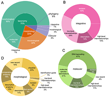 Research subject area. Taxonomic studies have been the major focus (70.1%) followed by morphological (22.3%) and phylogenetic ones (7.6%) (Fig. 2A).