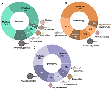 Targeted study taxa. Most manuscripts focused on single species, genus, or family-level (68.9%), followed by those focused on two or more taxa (multi-taxa, 27.7%). Some studies focused on Batoidea as a whole, and 10 studies on the orders Carcharhiniformes (4), Squaliformes (3), Lamniformes (1), Rajiformes (1), and Rhinopristiformes (1). Among those working on family-level or lower taxa, 17.6% regarded Potamotrygonidae and 13.5%, Carcharhinidae, whereas 29 families have been mentioned in less than 10 manuscripts in a total of 37. Excluding those multi-taxa papers, the majority comprised research on Batoidea (46.7%), followed by Galeomorphi (36.5%), Squalomorphi (15.6%), and Holocephali (1.2%). Potamotrygonidae was the most studied group within the subject areas “taxonomy” (12.1%) and “phylogeny” (18.5%), while within “morphology”, Carcharhinidae (19.0%) was the most studied family (Fig. 3).