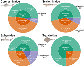 FIGURE 4| Percentage of studies within the shark families Carcharhinidae, Scyliorhinidae, Sphyrnidade, and Squatinidae, and within subject areas taxonomy, morphology, and phylogeny.