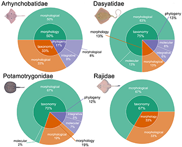FIGURE 5| Percentage of studies within the batoid families Arhynchobatidae, Dasyatidae, Potamotrygonidae, and Rajidae, and within subject areas taxonomy, morphology, and phylogeny.