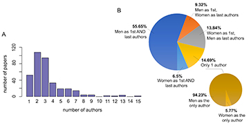 FIGURE 6| A. Number of papers written by 1 to 15 authors; B. Percentage of publications authored by men and women as first and last authors.