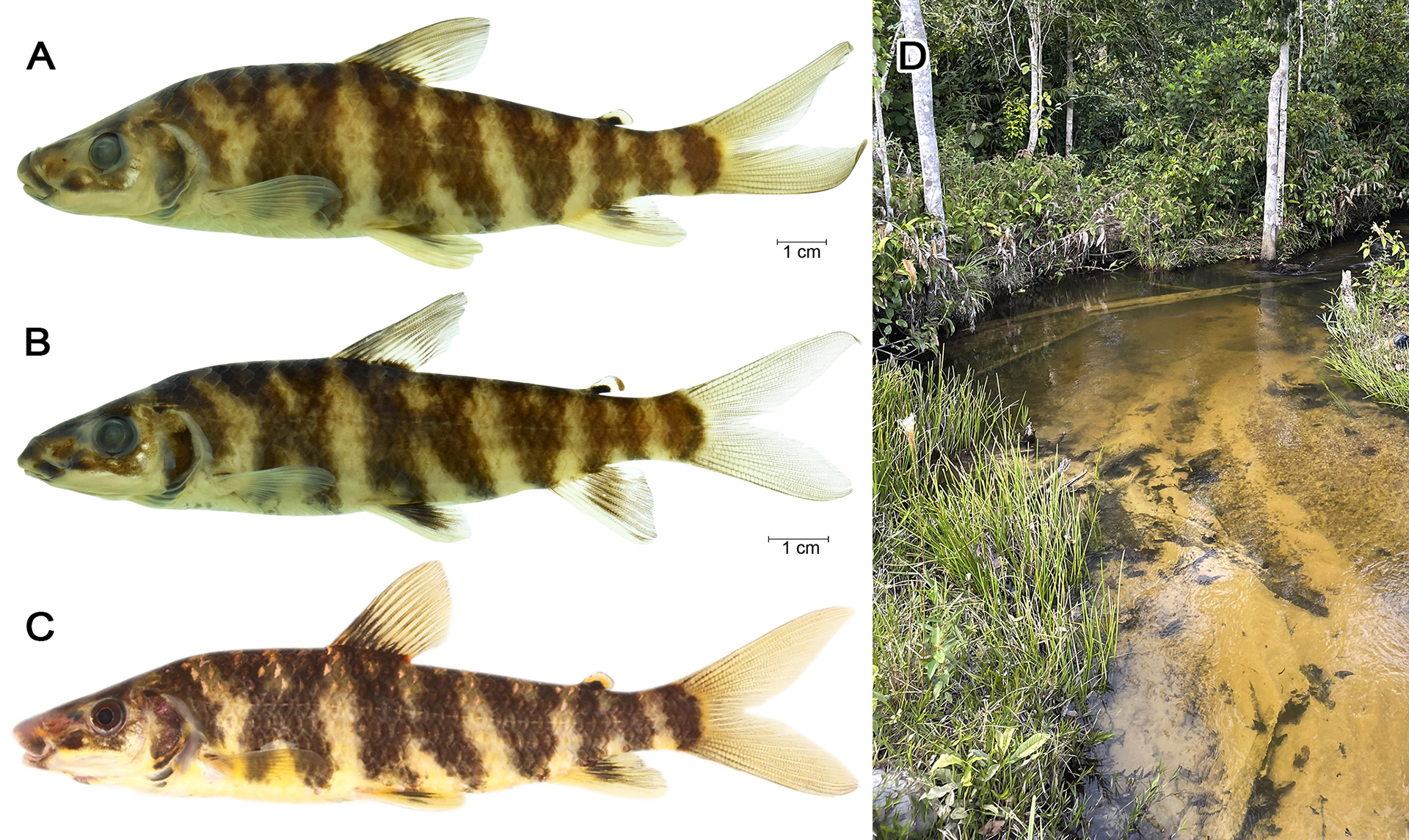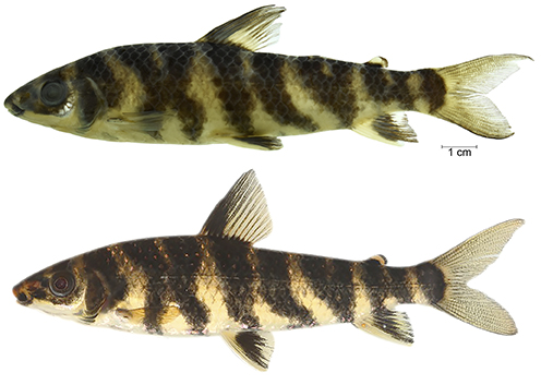 Leporinus bleheri and L. lignator share the coloration pattern composed of nine bars on the trunk, with second and third, and fourth and fifth bars connected forming an “X”, and the sixth bifurcated dorsally and “V” shaped. Trunk dark bars differ slightly in L. desmotes, L. enyae, L. jatuncochi, and L. villasboasorum, in which only the second and third bars are connected and “X” shaped. Furthermore, these species have dark dorsal and pelvic fins base. Leporinus tigrinus and L. pearsoni are also similar, having most bars shaped as “Y”. Leporinus fasciatus, L. affinis, and L. altipinnis have eight to fourteen dark bars, all shaped as an “I”, with dorsal and ventral ends slightly bifurcated in some specimens, pending on specimen development. Leporinus y-ophorus also has a unique color pattern, with seven trunk bars, and the third is “Y” or “V” shaped. Géry (1999) described L. bleheri and other species of the group using many letters such as “J”, “D” and “H”. Here, we are maintaining only the letters “I”, “Y”, “X” and “V” to describe the group. Following that nomenclature, the new species and L. bleheri can be described as “I-X-X-V-X-I”.