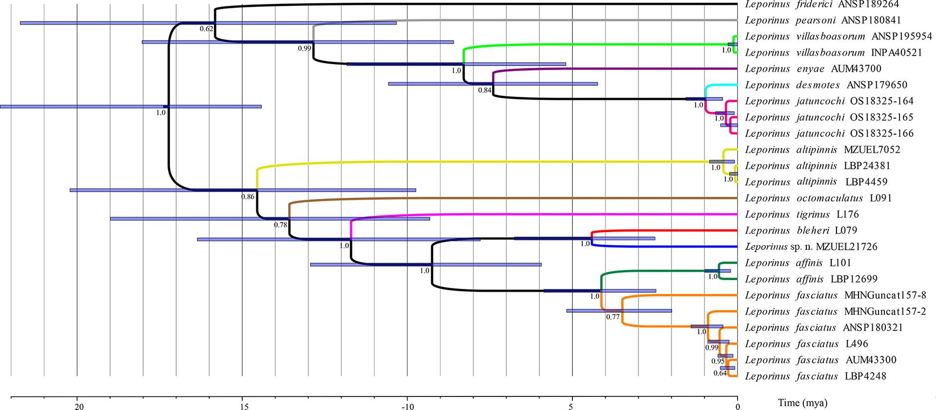 The distribution of Leporinus bleheri and L. lignator is also interesting. Both species occur in tributaries of the Madeira River, with L. bleheri being more widespread and occurring in other tributaries of the Amazon basin. However, neither species is apparently sympatric. This interesting fact could be related to an ecological preference of one or both species, which could be tested once more data is available. The speciation event that led to L. bleheri and L. lignator was estimated to have happened approximately four million years ago (Fig. 2), a time in which both species may have expanded their original distribution, forming what today seems a common distribution area.