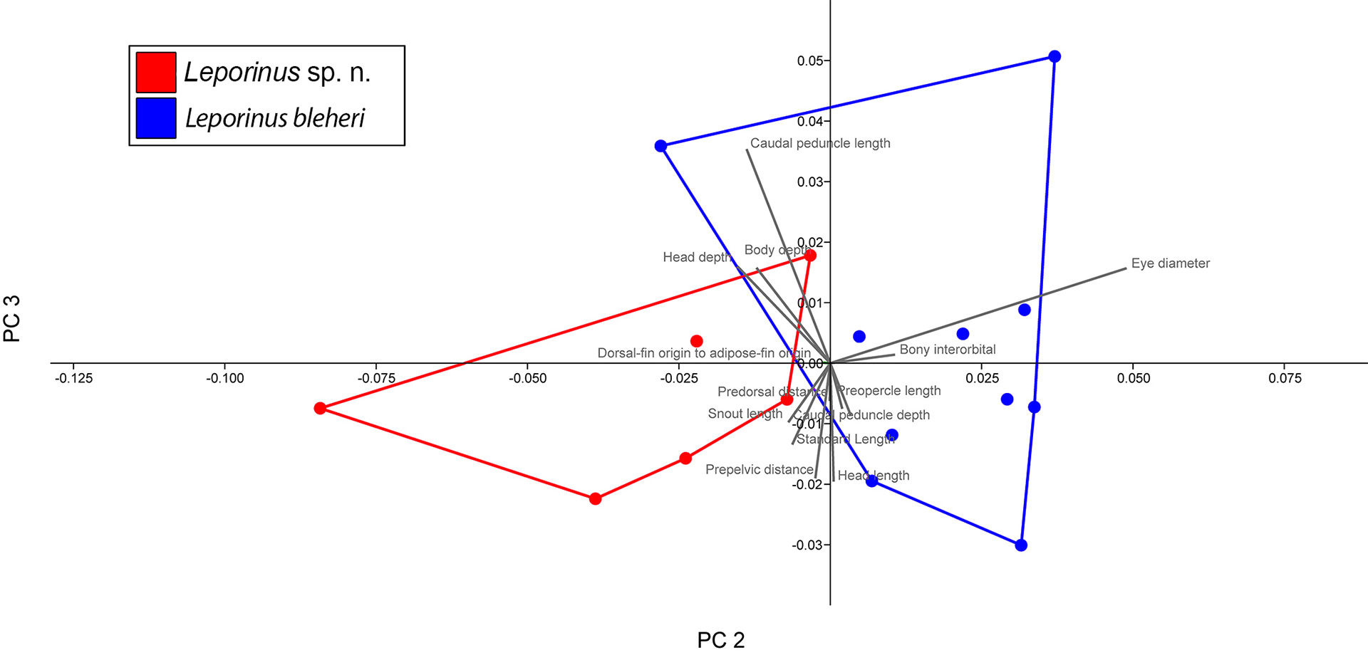 Morphological analyses. Meristic and morphometric data were obtained following Birindelli, Britski (2013). Counts and measurements were taken on the left side of specimens, with a digital caliper with 0.01 accuracy. Measurements related to the body and fins are presented in percentages of standard length (SL), and measurements related to the head are given in percentages of head length (HL). Samples were defined according to their collection data and preliminary analyses of meristic data. Morphometric data was compared using mean, minimum–maximum, and standard deviation values. A Principal Components Analysis (PCA) was performed using logarithmized measures on program PAST v. 4.10 (Hammer et al., 2001), where analyzed as a variance-covariance matrix, and with graphic results showed with convex hulls plotted in PC2 vs. PC3, as PC1 is known to be influenced by body size. A regression analysis was done in R v. 4.2.2 with the sma formula of the package SMATR to compare the size of the snout length with the standard length, all values logarithmized (Warton et al., 2012). All specimens are alcohol-preserved unless indicated. Institutional abbreviations follow Sabaj (2020). One specimen from each sample was cleared and double stained (CS) according to the protocol of Taylor, Van Dyke (1985) and dissected according to the Ridewood protocol (Bemis et al., 2004) for the osteological description. Osteological elements and complexes were photographed using a DFC295 digital camera attached to a Leica M205A stereomicroscope. Osteological terminology followed Weitzman (1962) with modifications used by Sidlauskas, Vari (2008).