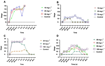 Long-term exposure protocol. In this experiment, fish (n = 8 each EO and concentration tested) were exposed individually and at the same time to each EO for up to 48 h, and were observed for 5 min at times 0, 10, 20 and 30 min, 1, 2, 3, 6, 12, 24 and 48 h, to check possible adverse effects and mortality. The concentrations (Tab. 2) were chosen according to the adverse effects presented by some of the evaluated EOs in sedative and/or anesthetic induction and recovery experiments and/or because only sedative concentrations were detected, aiming to evaluate possible bulbar collapse or intensification of adverse effects. Furthermore, stimulation was applied to the caudal peduncle with a glass rod, in specimens that appeared to be at the S4 stage. The control used in this protocol was ethanol, which had no effect in silver catfish (Heldwein et al., 2012). Ethanol was used to evaluate whether it really did not cause adverse effects and/or mortality in fish. Eugenol was not used in this protocol, as it was not necessary to compare adverse effects and/or mortality.