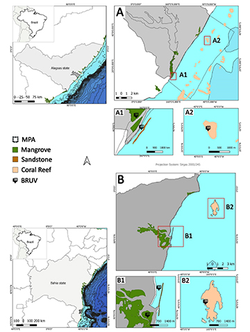 FIGURE 1|Representation of the areas of the RESEX Marinha Lagoa do Jequiá – AL (A) and Porto Seguro – BA (B). Mangroves, sandstone (A1) and coral reefs (A2) accessed at the RESEX.de Jequiá. Mangroves, sandstone (B1) and coral reefs (B2) accessed at the Porto Seguro. Marine protected area (MPA). The artificial habitats were not represented on the map as they are part of the mangrove area. The reefs were mapped by Santos et al. (2019).