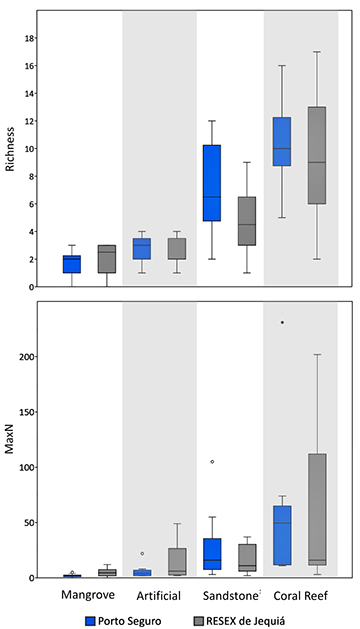 FIGURE 2| The localities of Porto Seguro (BA) and RESEX de Jequiá (AL) are separated by color. The boxplots of richness and MaxN by habitat show the maximum and minimum limits (upper and lower extremities). In the interquartile range are the third and first quartiles at the boundaries of the boxes and the most centralized horizontal line represents themean. Points outside the boxplots represent “outliers”, data found outside the observed pattern. The grey stripes only serve to separate the habitats.