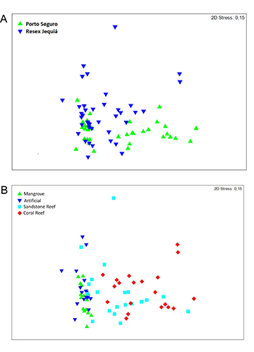 Finally, we understand that the disposition of sandstone reefs, as well as abiotic factors characteristic of each habitat, especially depth, represent structuring agents for estuarine and reef fish assemblages in our study. The similarity between the different habitats varied between 18–31%, indicating the relationship and sharing of species in the composition of the ichthyofauna and highlighting the importance of sandstone reefs dynamics between these environments, being ecologically vital for the maintenance of reef fish populations. Artificial estuarine habitats indicate that mangrove fauna is being shared, which is a worrying factor in the declining quality and area of the environment. However, further investigations are needed.