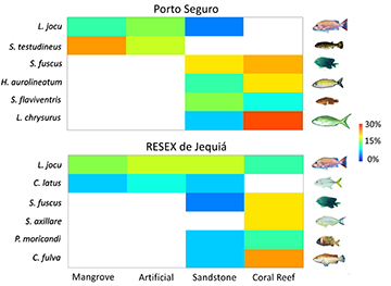 FIGURE 4| Distribution of the most frequent species by habitat for Porto Seguro (BA) and RESEX de Jequiá (AL). Warmer colors (close to red) represent higher frequencies of species among the samples.