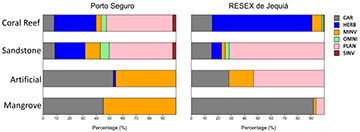 FIGURE 5| Proportion in percentage of trophic groups by habitat for Porto Seguro (BA) and RESEX de Jequiá. Fish trophic categories: carnivore (CAR); herbivore (HERB); mobile invertebrate feeders (MINV); omnvivore (OMNI); planktivore (PLAN); sessile invertebrate feeders (SINV).