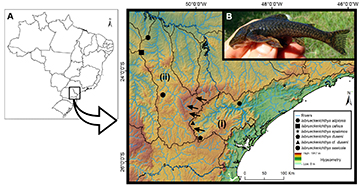FIGURE 1| Collection sites and representative image of an Isbrueckerichthys species. A. Partial map of Brazil highlighting south/southern hydrographic basins of the Ribeira de Iguape River (i) and Tibagi River (ii). The arrows show the Ponta Grossa Arch region in eastern Paraná State, Brazil (a relief barrier between lowlands and uplands hydrographic basins). The map shows elevation and valleys in the relief, and the geometric shapes indicate the collection site of the specimens of Isbrueckerichthys analyzed. B. Live specimen of I. calvus photograph taken during capture in the Juruba stream.