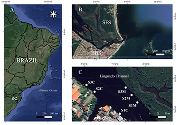 The Linguado Channel has an area of approximately 1,250 hectares, is ~20 km long, and separates two cities, São Francisco do Sul (SFS) and Balneário Barra do Sul (BBS). Along its length, there are remnants of dune forest and mangroves, already significantly altered by human occupation (ICMBio, 2018; Kilca et al., 2019). Tourism and artisanal fishing are the main economic activities in the estuary (Gerhardinger et al., 2021).