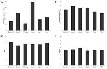 Physico-chemical parameters. The precipitation varied between 60.8mm and 247.4mm (x̅=119.305mm) (Fig. 2A), water temperature fluctuating between 20.9°C and 30.4°C (x̅=25.7°C) (Fig. 2B), the pH of water values ranging between 6.52 and 8.73 (x̅=7.52) (Fig. 2C) and salinity of water from 14.50 to 33.00 (x̅=25.60) (Fig. 2D). The NMDS suggests that abiotic data are similar across months, however, May seems to be the most dissimilar, suggesting the beginning of seasonal transition (Fig. 3).