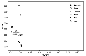 FIGURE 3| Non-metric multidimensional scaling (NMDS) representation of abiotic data from Linguado Channel, Babitonga Bay, southern Brazil, for December 2021 to May 2022. Symbols indicate sampling months.