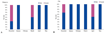 FIGURE 5| Sex ratio of longsnout seahorses in the Linguado Channel, Babitonga Bay, southern Brazil, from December 2021 to May 2022. A. Mangrove area and B. City area.