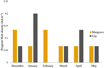Sex ratio was male biased in most of the samples, at both mangrove and city areas (Fig. 5), presenting a significant difference between both sexes at both sites (Mangrove: p = 0.001; Χ2 = 10.22; gl = 1; City: p < 0.001; Χ2 = 18.48; gl = 1). There was no difference in sex ratio between both areas (p = 0.317; Χ2 = 1.001; gl = 1). Considering male pregnancy, there was no evidence of a significant difference in pregnant male density between both studied areas (p > 0.999; W = 0.001) (Fig. 6).