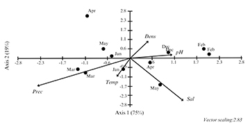 The canonical correspondence analysis (CCA) did not reveal any clear pattern of data distribution (Fig. 7). The first two axes together explained 94.0% of the data variation (axis 1 75.0% and axis 2 19.0%). The figure suggests a degree of relationship between seahorse density and the pH in December, January and February. Precipitation was mainly correlated with March and appears to negatively influence seahorse density.
