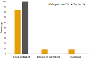Behavior and holdfast use. Most of the longsnout seahorses were resting attached (91.3%), while one was resting on the bottom (4.3%), and one was swimming (4.3%). However, comparing the behavior between both areas, longsnout seahorses from mangrove area had a broader behavior repertoire (Fig. 8). Holdfast use was different between sampling areas, in which seahorses observed in the city area were grasping metal fences and ropes, while seahorses in the mangrove area were grasping mangrove branches and branches on the bottom (Fig. 9).