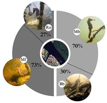 FIGURE 9| Holdfast utilization of longsnout seahorses in mangrove (light grey) and city (dark grey) areas in the Linguado Channel, Babitonga Bay, southern Brazil, from December 2021 to May 2022. Holdfasts types include mangrove branch (Mb), branch on the bottom (Bb), metal fence (Mf) and rope (Ro).