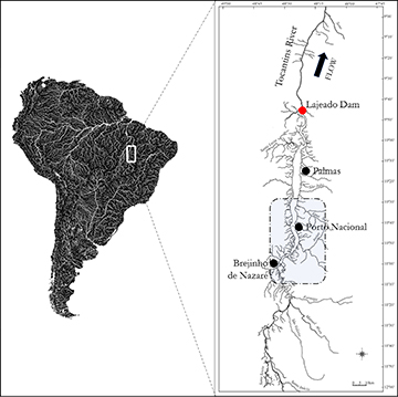 The study area (Fig. 1) is under the influence of the Luís Eduardo Magalhães Hydroelectric Plant (Lajeado Dam), with an installed capacity of 902.5 MW, located in the middle Tocantins (09o45’26.90”S 48o22’19.21”W). This dam is the 5th in the cascade of dams along the river, constructed between 1998 and 2002. It formed a large impoundment (630 km2 surface area, 150 km long, 8.8 m average depth, 24 days retention time) that flooded vast areas of savanna vegetation. A long river segment of about 190 km exists between the upper zone of the reservoir and the next dam upstream (Peixe Angical Dam), where some important tributaries flow into the Tocantins River, such the Manuel Alves, Santa Teresa and São Valério (Fig. 1). Both the Lajeado and Peixe Angical dams are equipped with fish ladders (weir and pool type), but which were closed due to operational problems related to malfunctioning and potential impacts on migratory fish (Agostinho et al., 2011; Pelicice, Agostinho, 2012).