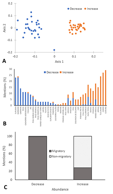 To characterize the main ethnospecies associated with each question, we calculated the number of citations received by each; the same procedure was conducted considering reproductive strategies (i.e., long-distance migratory and non-migratory species).
