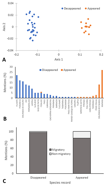 Fishers mentioned 29 ethnospecies (176 mentions) that disappeared (20 taxa) or appeared (9 taxa) in the impounded area. The NMDS analysis separated the two groups (Fig. 3A), although the high stress value (0.4189) indicates poor representation. However, the composition of groups was clearly different according to PERMANOVA (F = 38.9; p < 0.0001); responses regarding species that disappeared were more heterogeneous (PERMDISP: F = 33.3; p < 0.0001). The most cited species that disappeared involved large catfishes (Siluriformes) such as filhote, dourada de couro, jaú and pernambuco, in addition to piabanha; main species that appeared were mapará and dourada de escama (Fig. 3B). Most mentions to ethnospecies that appeared (84.3%) and disappeared (97.6%) involved migratory fish (Fig. 3C).