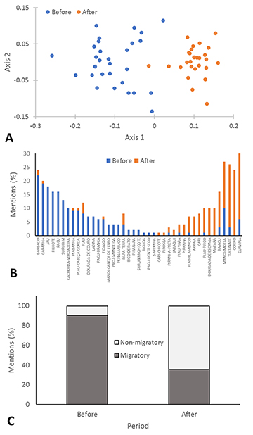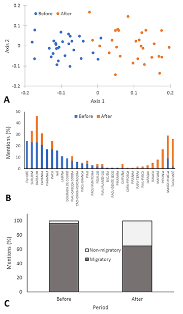 Fishers mentioned 30 ethnospecies (352 mentions) among the most valued before (22 taxa) and after (20 taxa) the construction of Lajeado Dam. Some were mentioned in both periods, but the composition of the groups was clearly different, as evidenced by the NMDS analysis (stress = 0.2237; Fig. 5A) and confirmed by PERMANOVA (F = 19.7; p < 0.0001); responses regarding the after period were more heterogeneous (PERMDISP: F = 6.9; p < 0.01). The most valued species before river regulation were filhote, surubim, barbado, caranha, piabanha, pacu and jaú, while the most valued after were tucunaré, barbado, mandi-moela and pirosca (Fig. 5B). Migratory fish accounted for most mentions before (96.1%) and after (64.9%), but mentions to non-migratory fish increased in the after period (Fig. 5C).