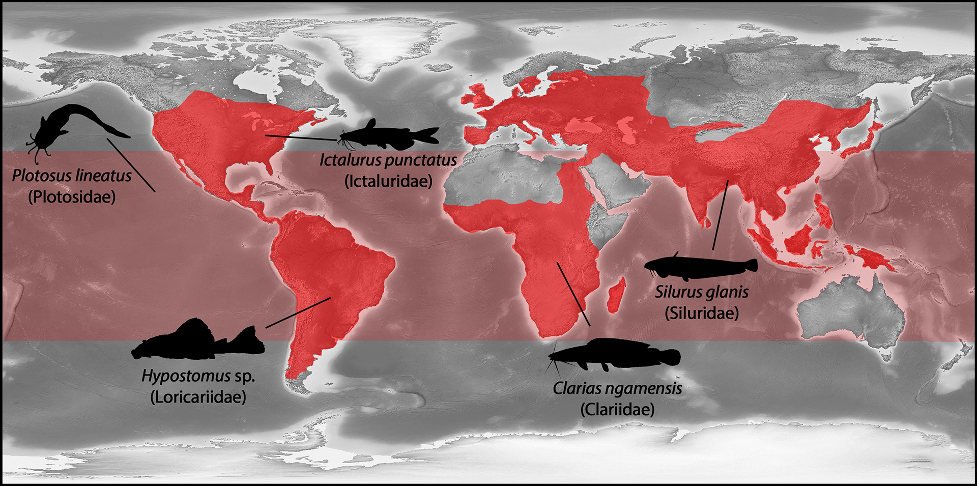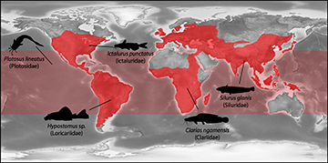 FIGURE 1| World map showing the distribution of Siluriformes (red areas) according to Nelson et al. (2016) and GBIF (2023), with illustrations of important families in distinct regions.