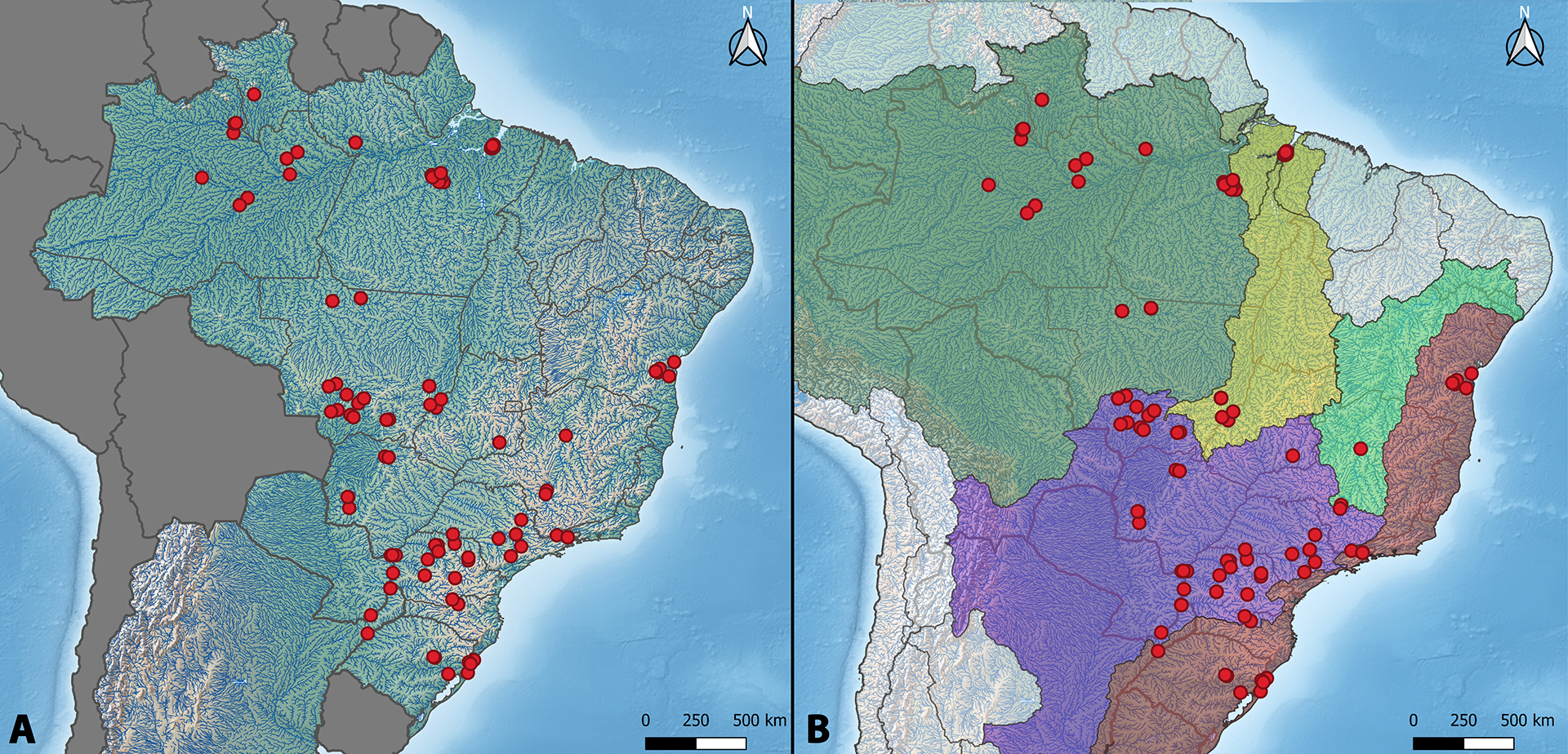 FIGURE 2| Partial maps of South America showing the distribution of Loricariidae species (red dots) investigated by cytogenetics that have the geographical coordinates published together. A. Map highlighting the geopolitical regions of South America, with emphasis on Brazil, Paraguay, and part of Argentina territory; B. Map highlighting the hydrographic basins of South America, with emphasis on Amazonas (green), Tocantins-Araguaia (yellow), Paraná/Paraguay (purple), São Francisco (cyan), Atlantic East and Atlantic South (red) River Basins.